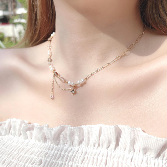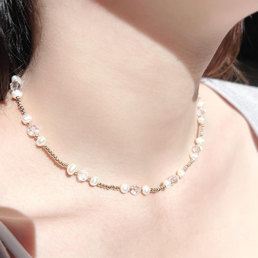 鑽切白水晶天然淡水珍珠14K包金項鍊鎖骨鍊