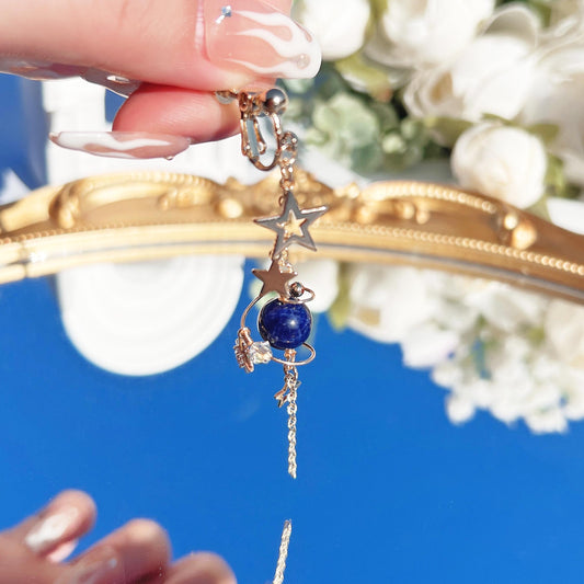 白水晶海藍寶藍磷灰月光石 小雪花 14K包金 不對稱耳骨夾耳環