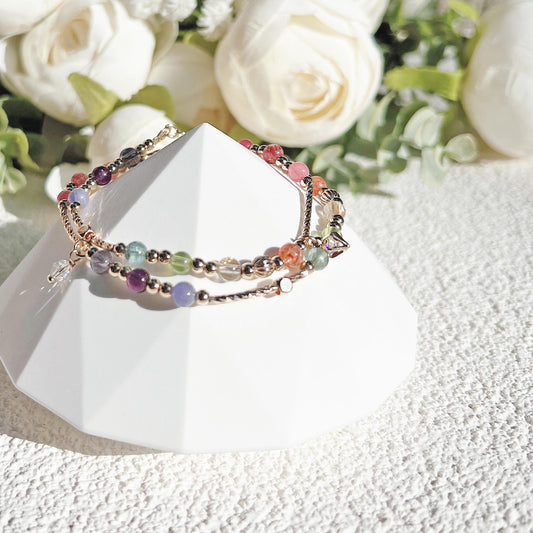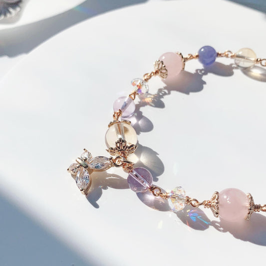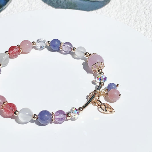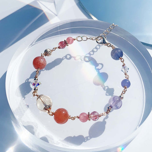 紫鋰輝月光石紫水晶坦桑石粉晶草莓晶鑽切白水晶14k包金手鍊