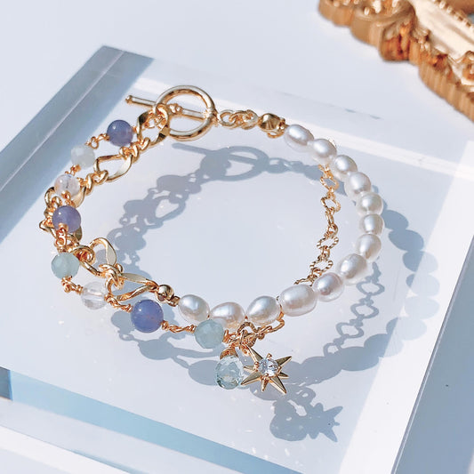 坦桑石海藍寶月光石淡水珍珠14k包金雙層手鍊
