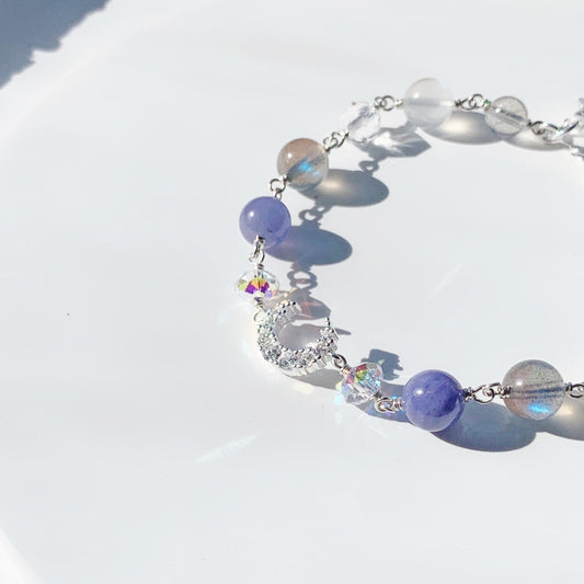 坦桑石拉長石月光石鑽切白水晶S925純銀手鏈